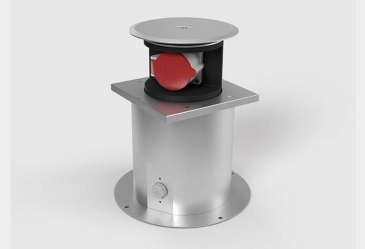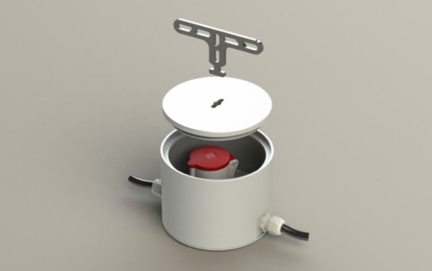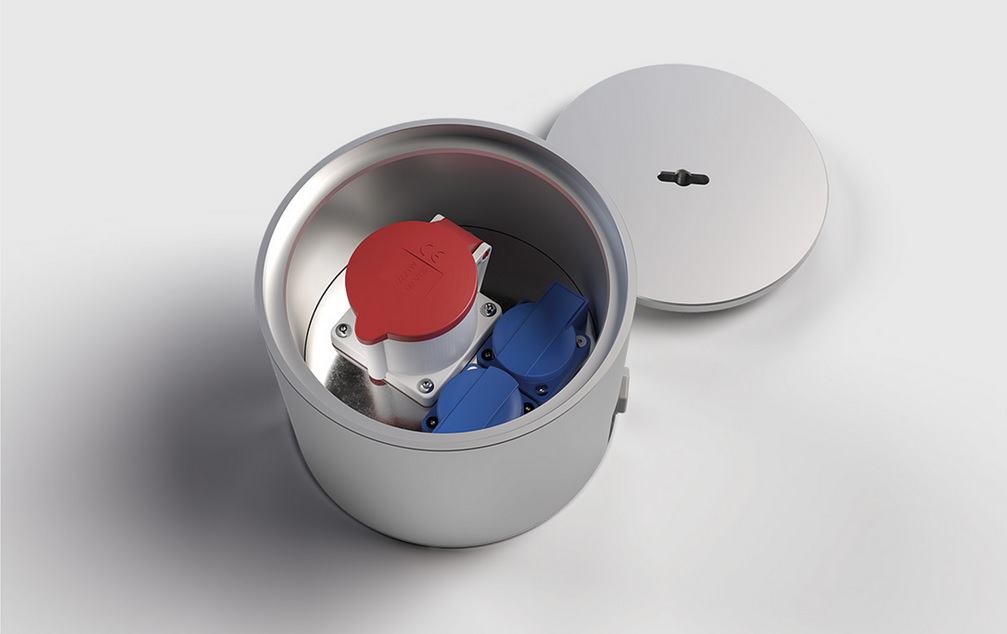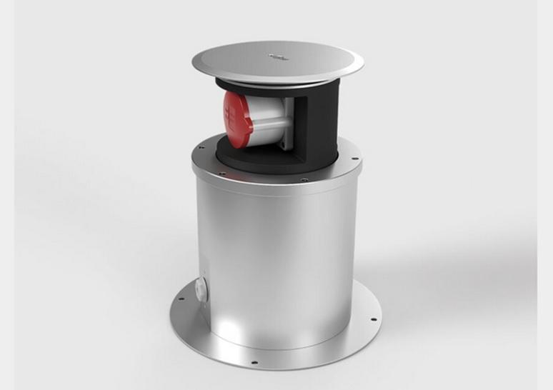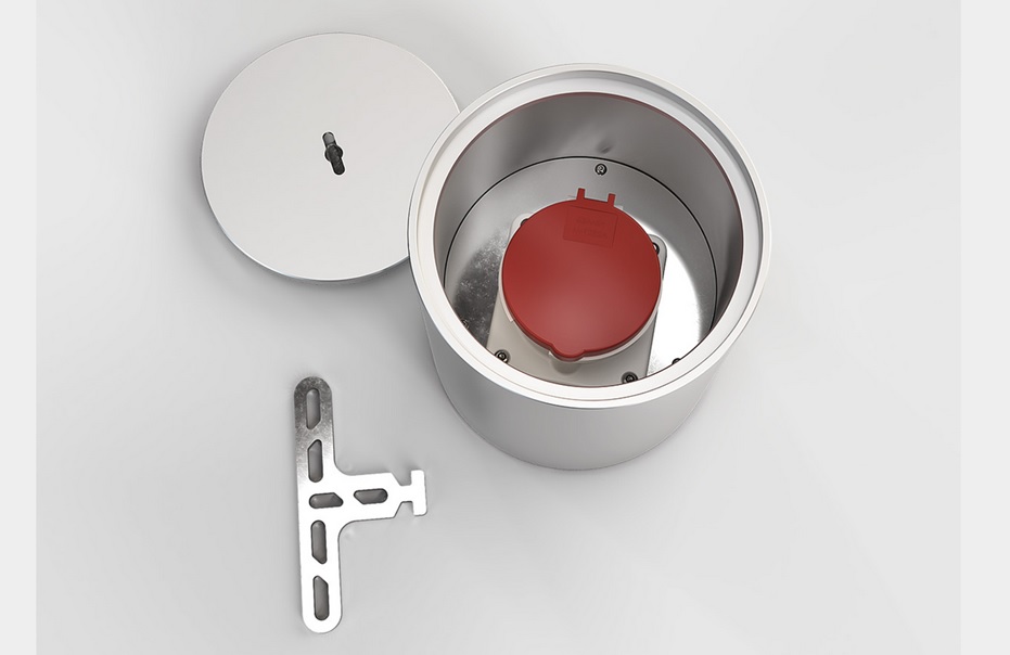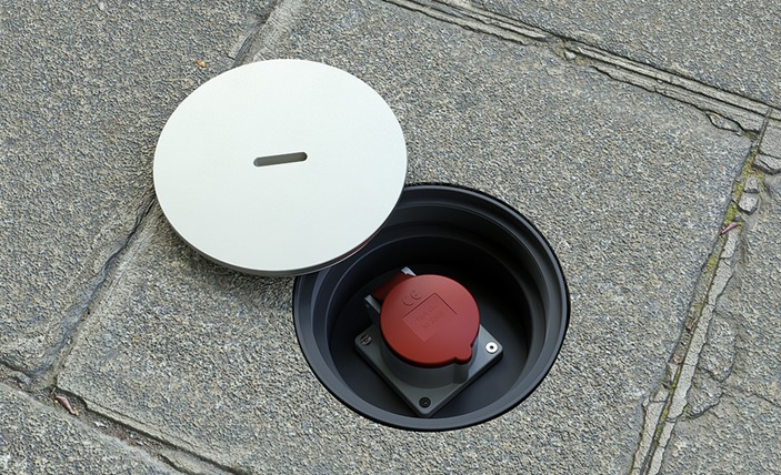 Outdoor plug-in piston floor box (socket box into the ground). Protection class is IP 67 / IP 44 for outdoor use. Made from aluminum and durable under passenger cars. The socket box ejects out and plugs in manually by a special key.