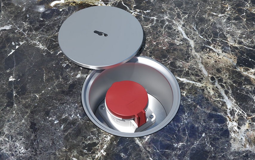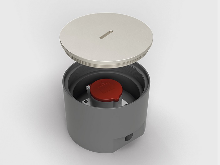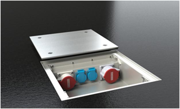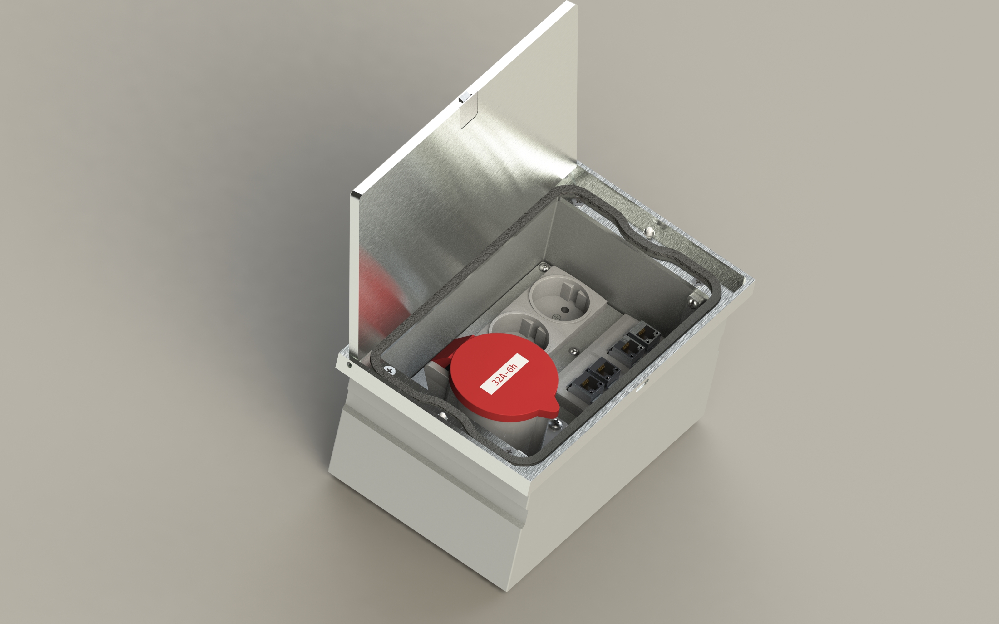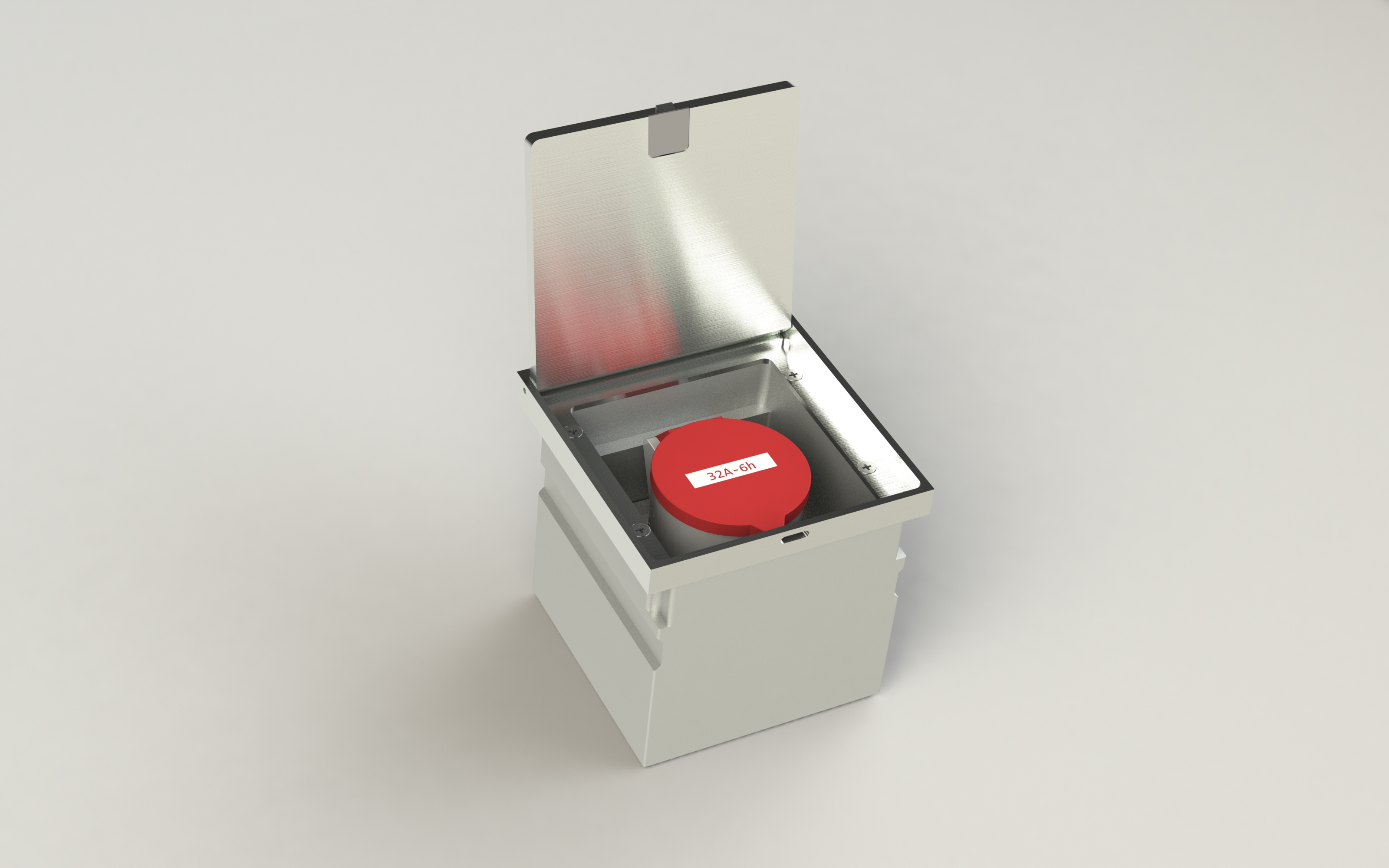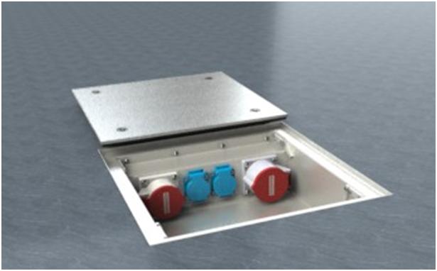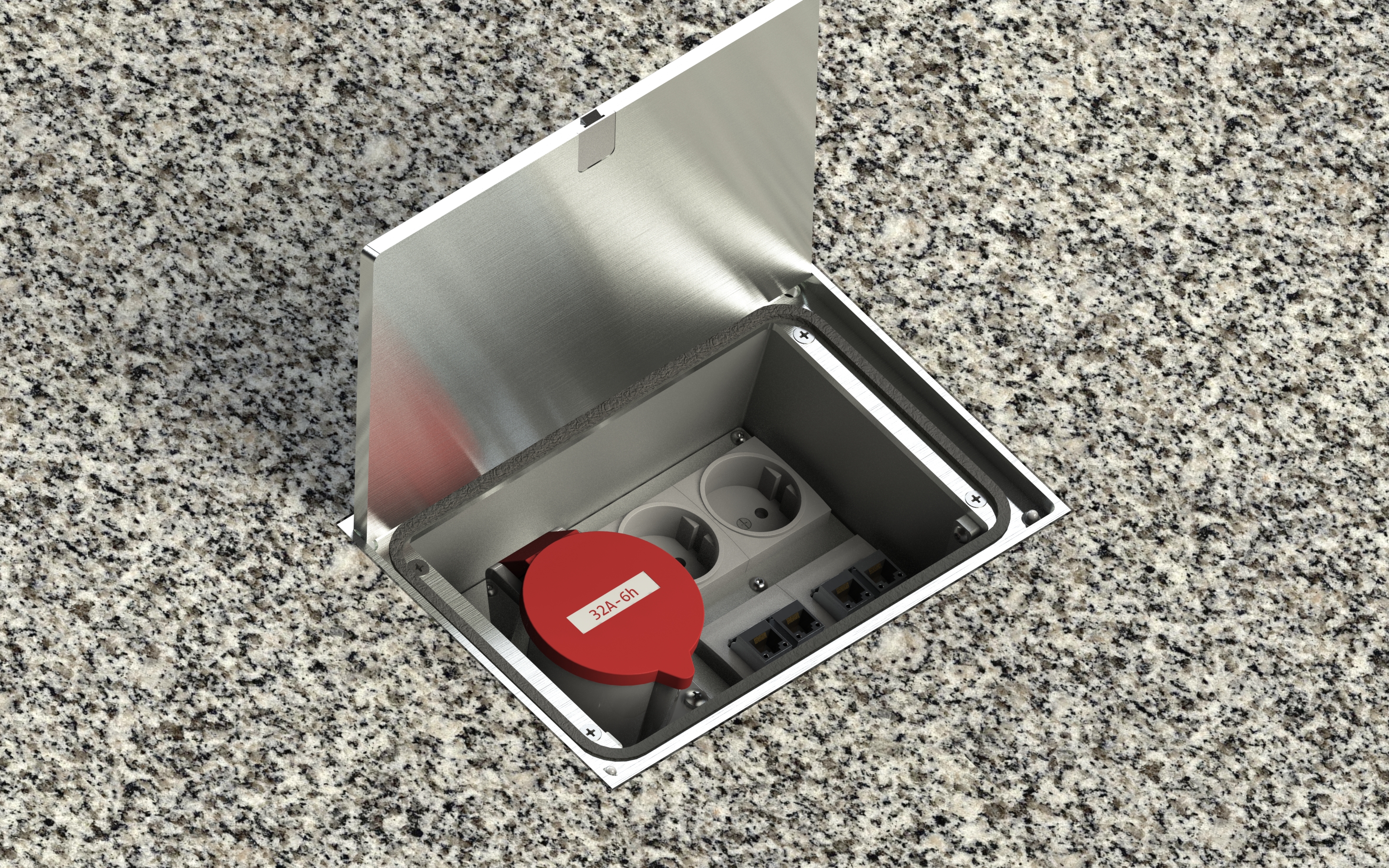 Every plug has got the cover. A protection class in the eject state is IP 54 (without interconnection / cabling). Cable entry: at the bottom, total 4x M32. The floor box is waterproof with a protection class IP67, when its closed in. Load-carrying capacity is 6,5t.