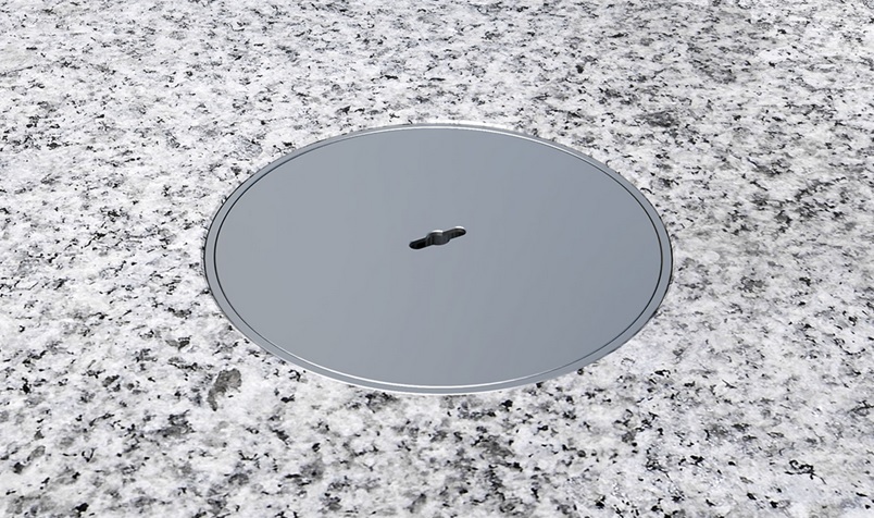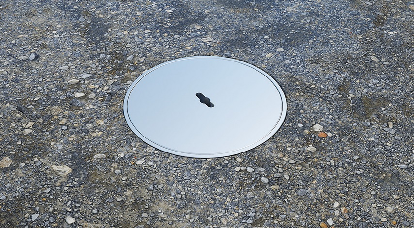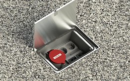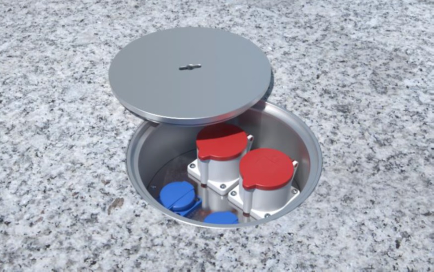 Outdoor plug-in piston floor box (socket box into the square). Protection class is IP 67 / IP 44 for outdoor use. Made from aluminum and durable under passenger cars. The socket box ejects out and plugs in manually by a special key.
