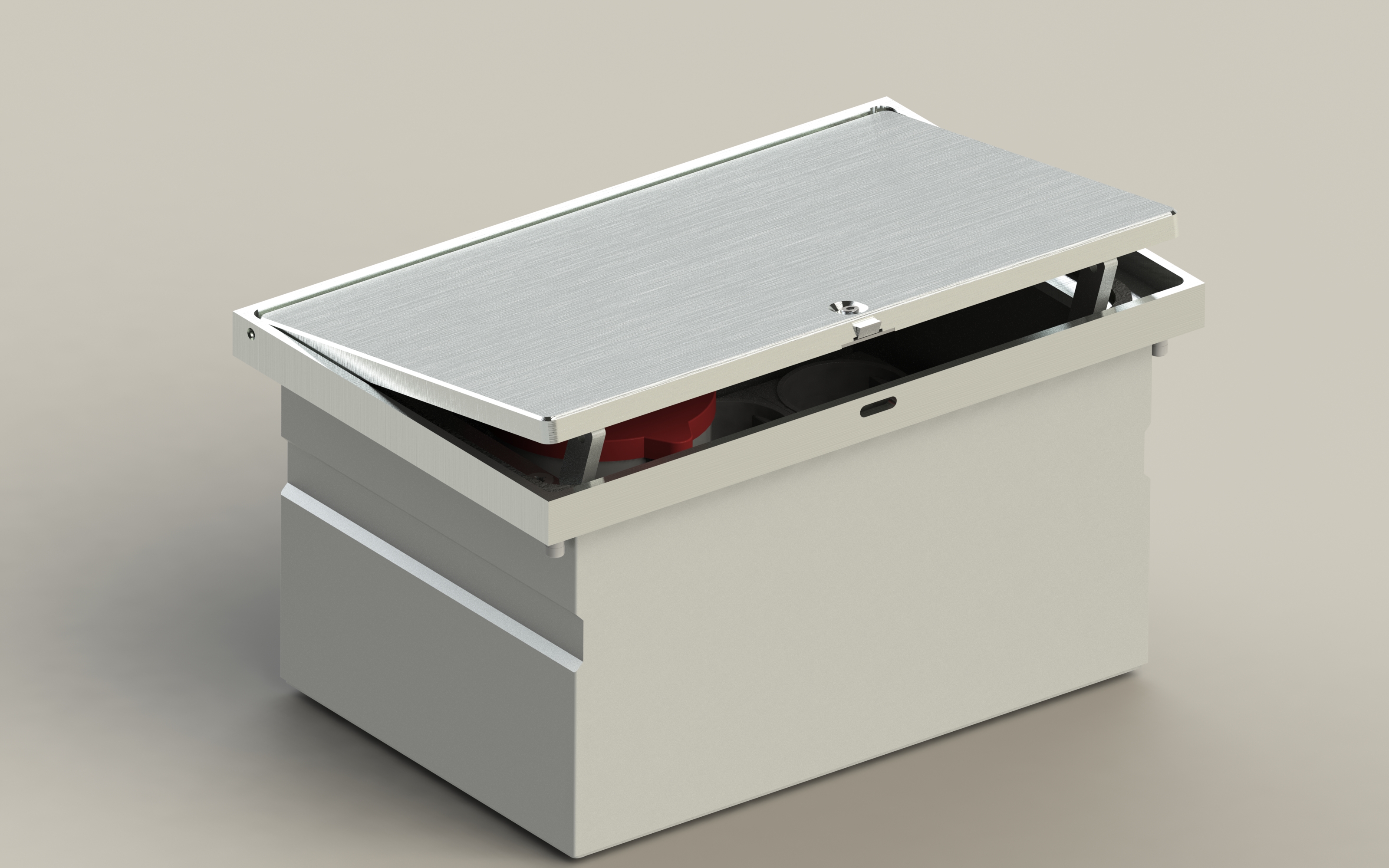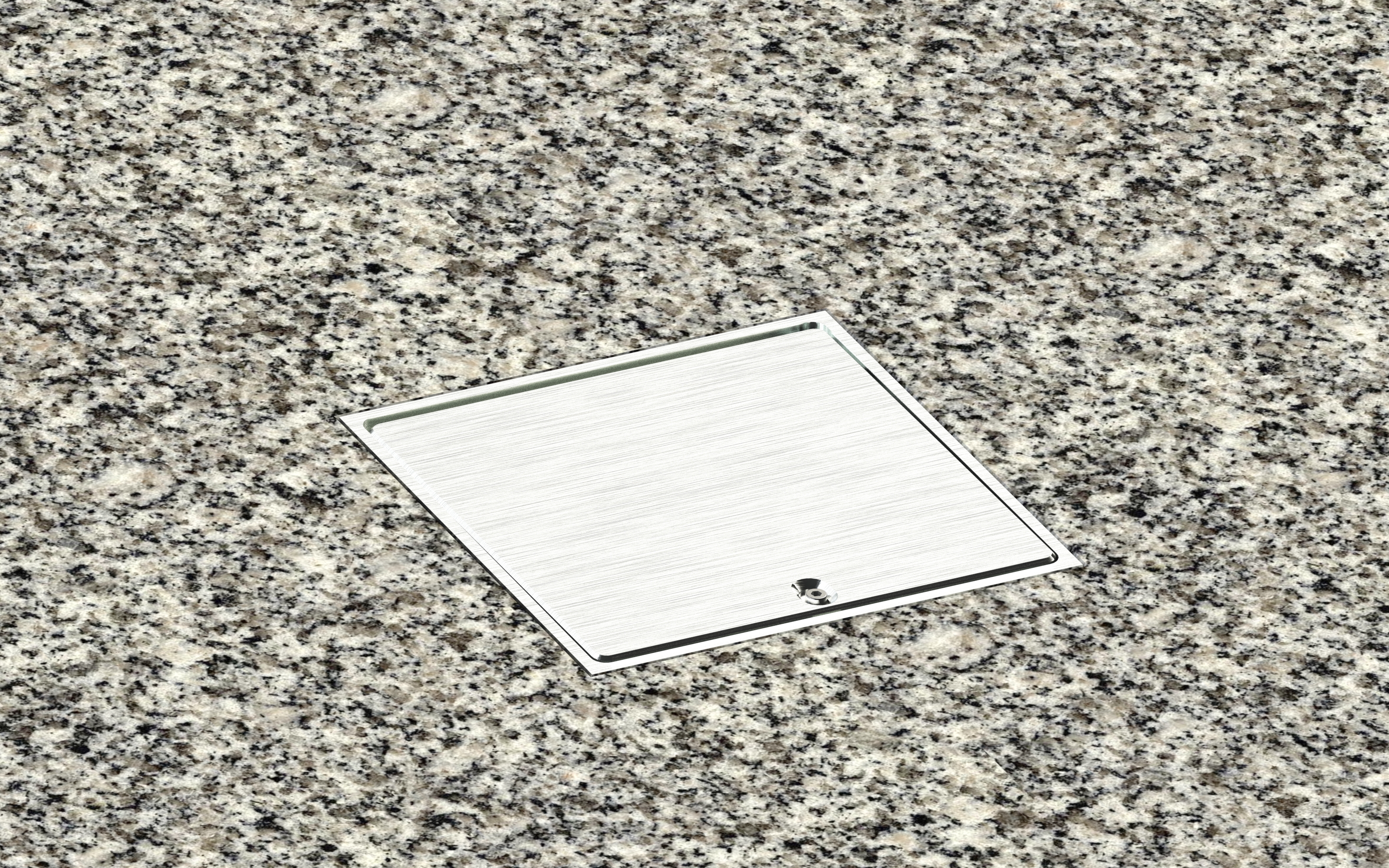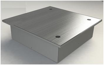 Industrial floor box with a lid. Suitable under various floor cleaners. The floor box has got an aluminum lid and the frame made from stainless steel, anodized. Possible to run over the floor box by passengers cars.