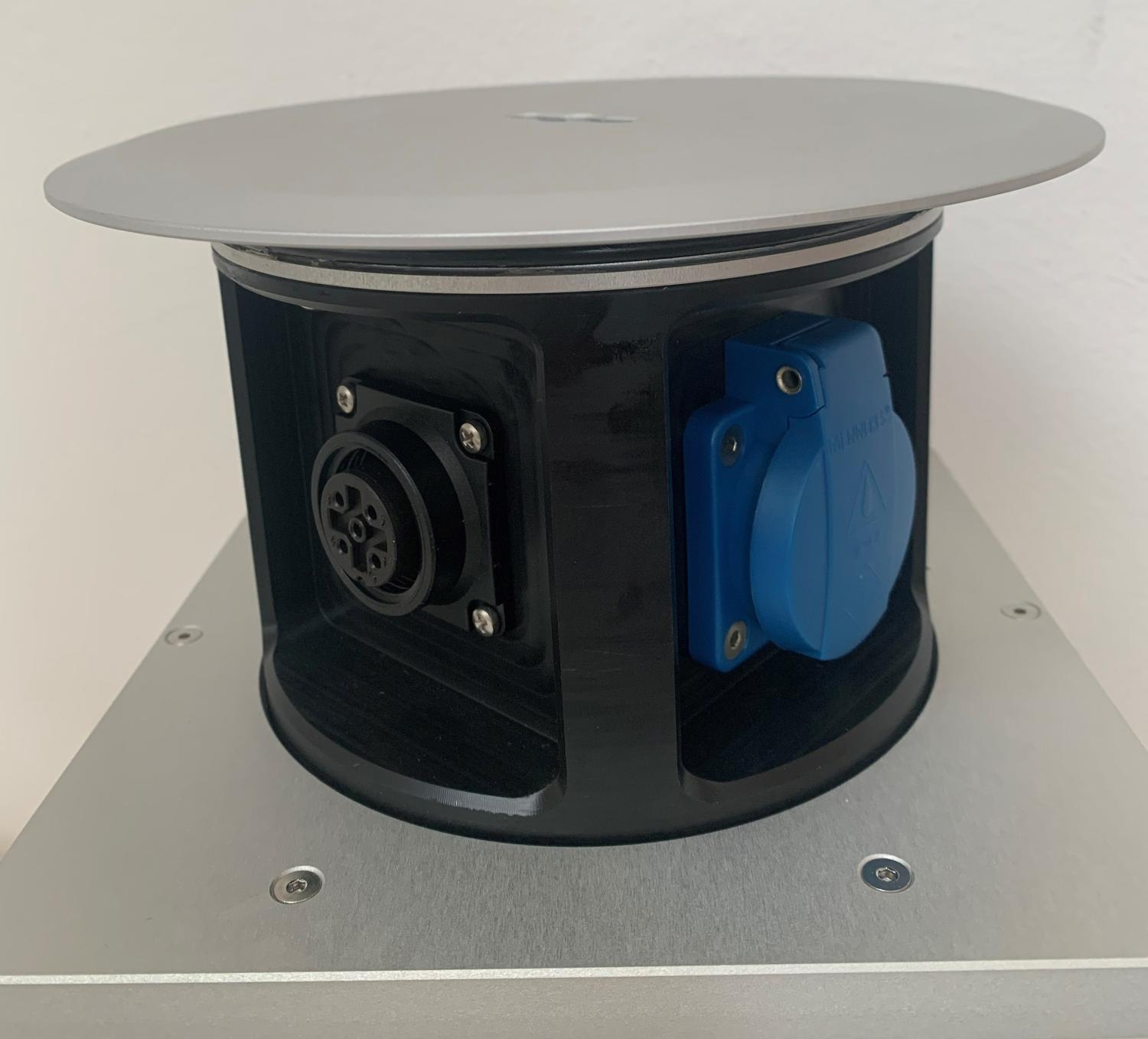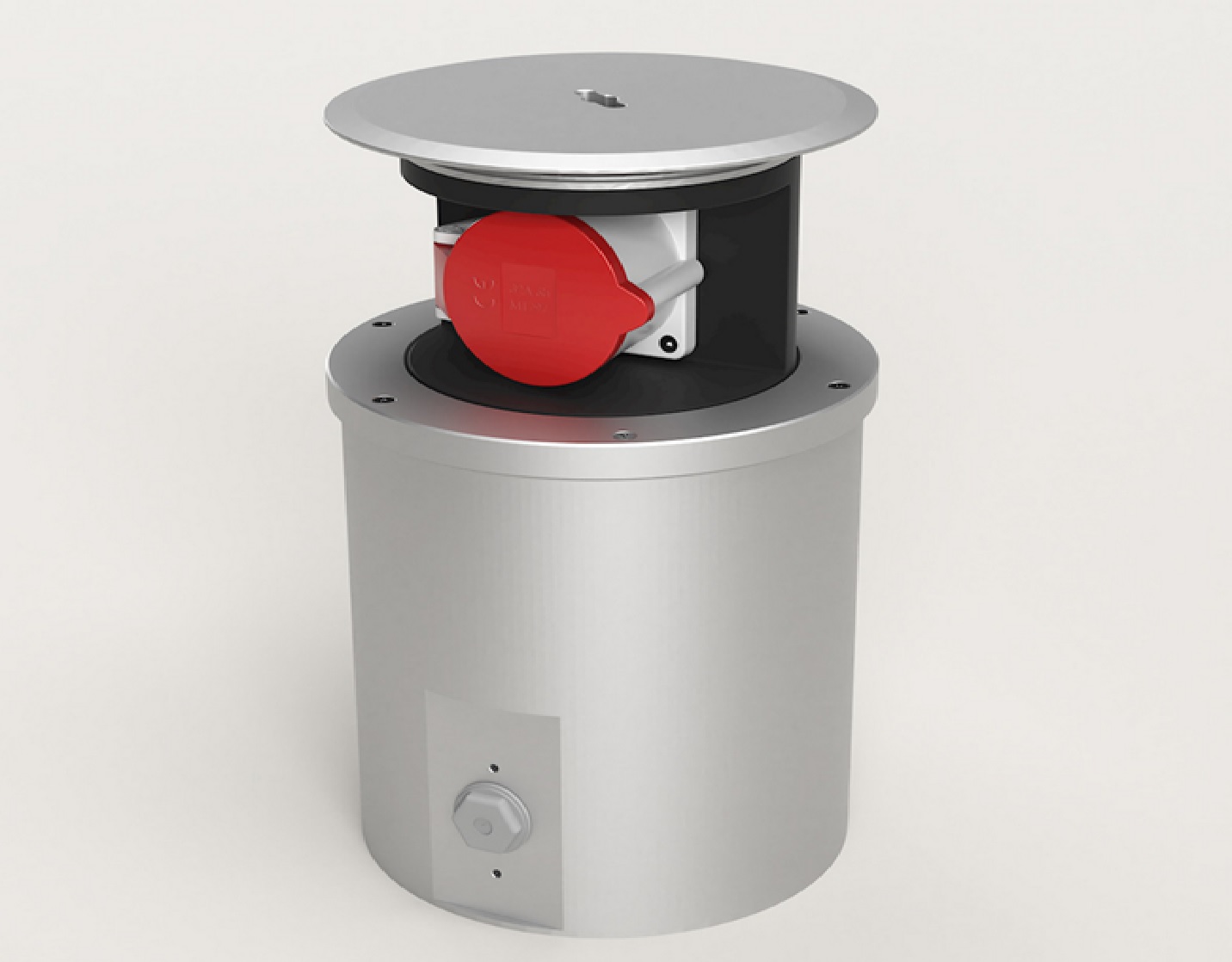 Outdoor plug-in floor box (socket box into the ground). Protection class is IP 67 / IP 44 for outdoor use. Made from aluminum and durable under passenger cars. The socket box ejects out and plugs in manually by a special key.