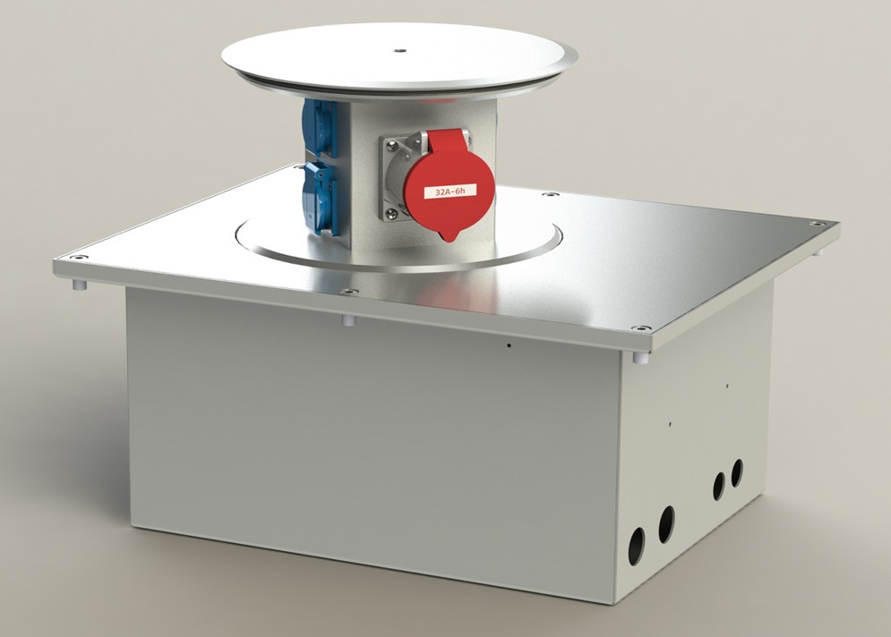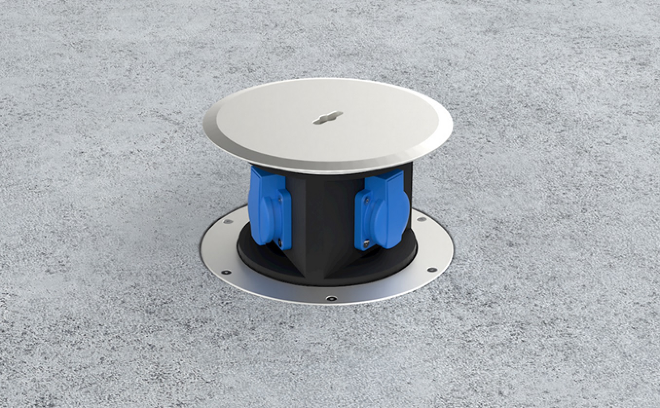 Every plug has got the cover. A protection class in the eject state is IP 44 (without interconnection / cabling). Cable entry: at the bottom, total 4x M32. The floor box is waterproof with a protection class IP67, when its closed in. Load-carrying capacity is 6,5t.