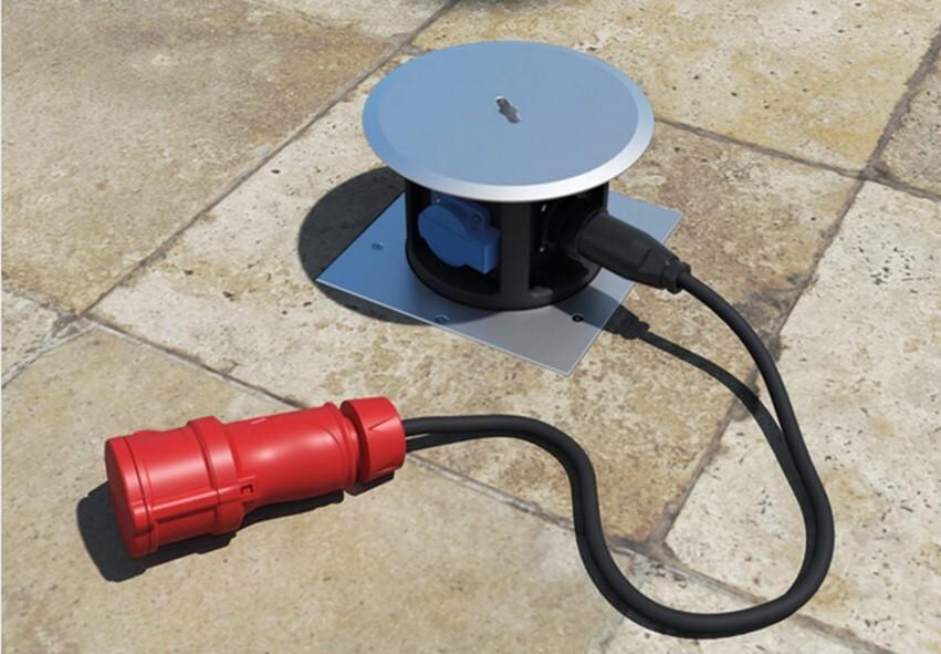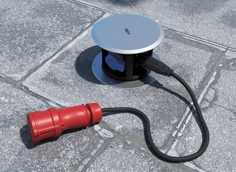 Outdoor plug-in floor box (socket box into the square). Protection class is IP 67 / IP 44 for outdoor use. Made from aluminum and durable under passenger cars. The socket box ejects out and plugs in manually by a special key.