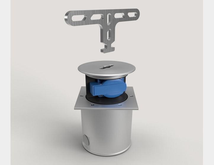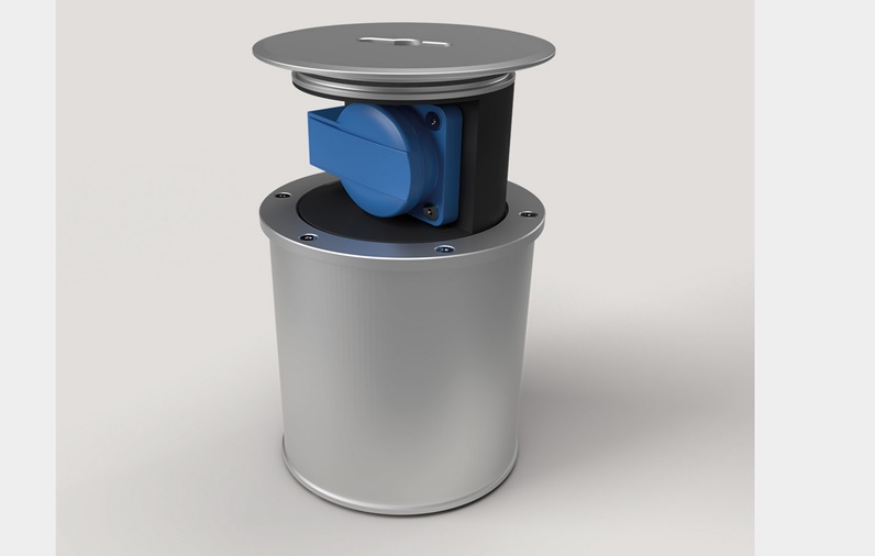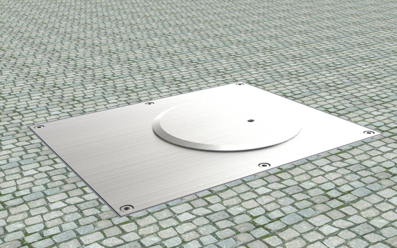 Outdoor plug-in piston floor box (socket box into the ground). Made from heavy-duty aluminum and durable under vehicles up to 10 tonnes. Surface resembles anodized stainless steel. Using the allan key, the socket box can be raised out or lowered in.